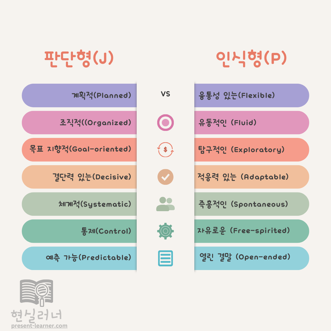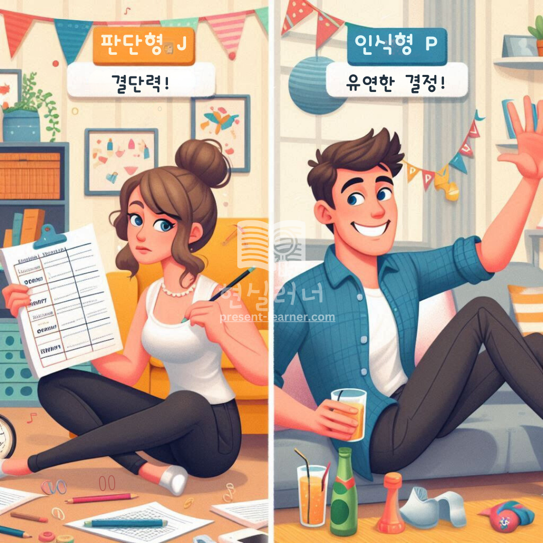 MBTI에서 J(Judging)와 P(Perceiving)의 차이는 주로 사람들이 외부 세계와 어떻게 상호작용하고 조직화하는지를 반영해요. J와 P는 각각 독특한 방식으로 일상생활과 계획, 의사 결정 과정을 다룹니다.