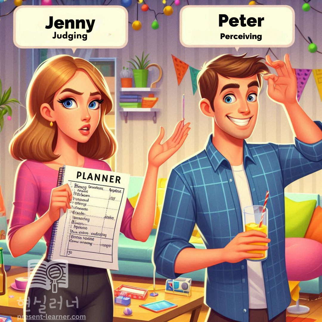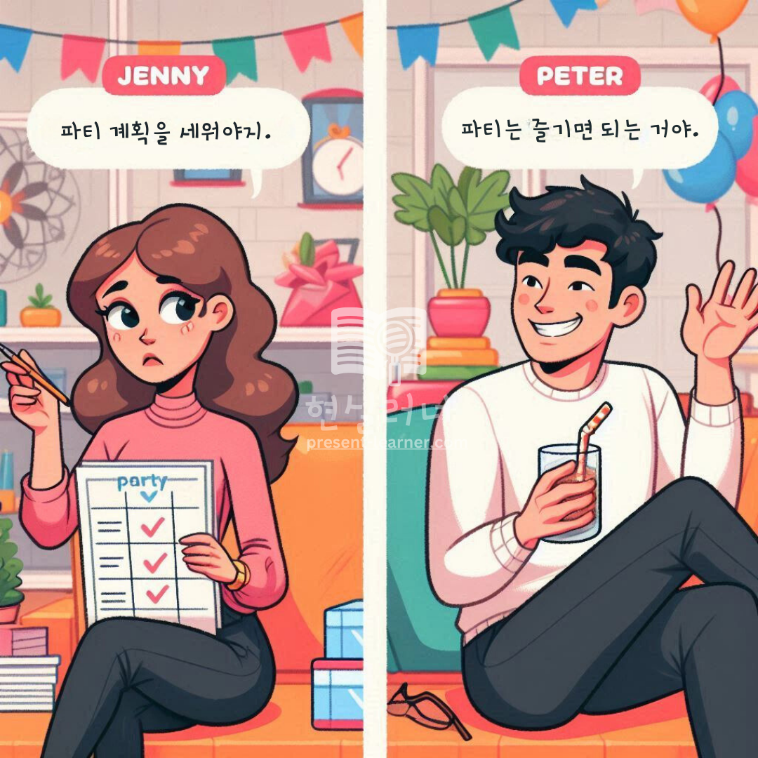 제니는 친구들을 초대해서도 계획적으로 행동하려고 하고 피터는 자연스럽게 하는 걸 더 원해요.