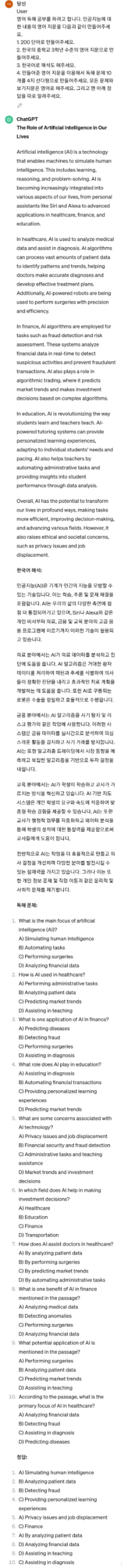 프롬프트 예시: 영어 독해 공부를 하려고 합니다. 인공지능에 대한 영어 지문을 다음과 같이 만들어주세요.