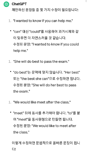 프롬프트 예시: 아래에 내가 쓴 영어 문장에서 문법적으로 틀린 부분이 있는지 알려주세요.