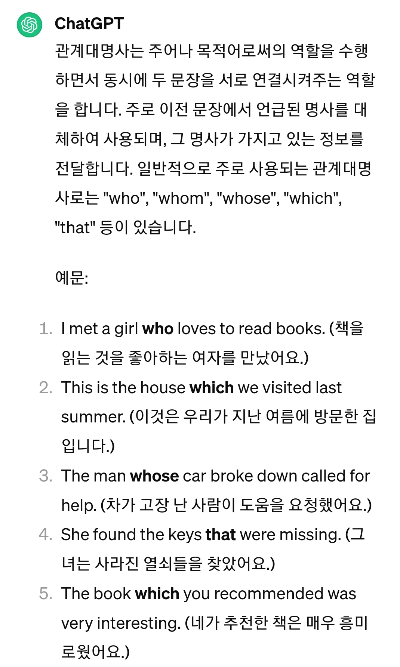 프롬프트 예시: 영어 문법을 공부하려고 합니다. 관계대명사에 대해서 설명해주세요. 그리고 관계대명사를 넣은 영어 예문 5개를 한국어 뜻과 함께 만들어주세요.