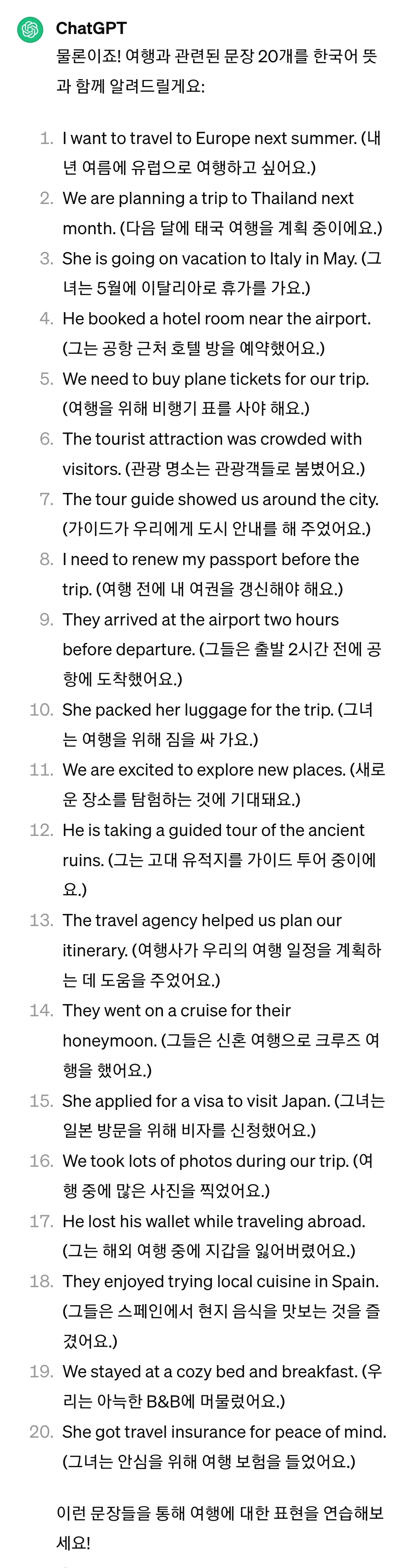 프롬프트 예시- 초급 영어 학습자로 기본 문장 구조와 표현을 연습하고 싶습니다. 여행(원하는 주제)과 관련된 문장 20개를 한국어 뜻과 함께 알려주세요.
