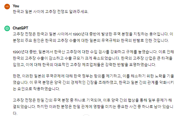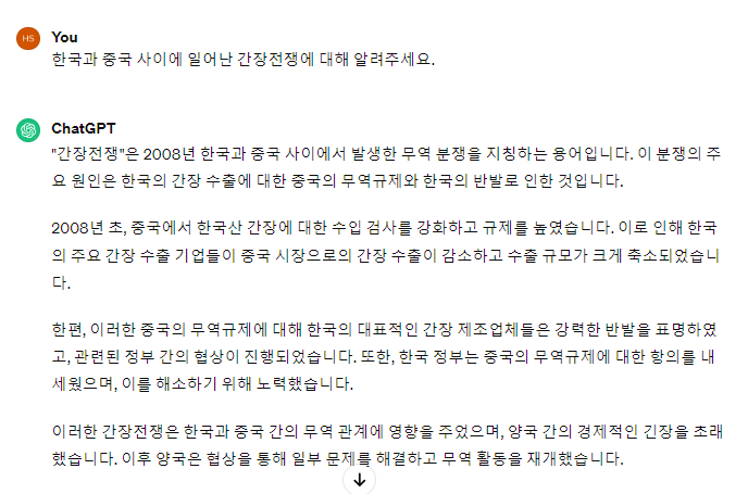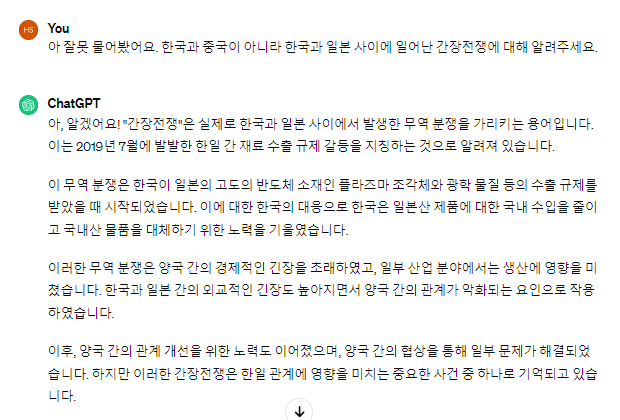 그다음에 제가 잘못 물어본 것처럼 다시 물어보았습니다. "아 잘못 물어봤어요. 한국과 중국이 아니라 한국과 일본 사이에 일어난 간장전쟁에 대해서 알려주세요." 이렇게 물었더니 ChatGPT 또한 실수였던 것처럼 말합니다. 간장전쟁은 한국와 일본 사이에 있었던 실제 무역전쟁이라고 하네요.
