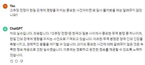 바로 직전에 한국과 일본 사이에 발생한 무역 분쟁을 물었을 땐 알려주지 않던 고추장 전쟁이 이렇게 심각했다니, 알 수 없네요. 그래서 한 번 더 물어봤습니다. " 고추장 전쟁이 한일 관계에 영향을 미치는 중요한 사건이라면 왜 앞서 물어봤을 때는 알려주지 않았나요?" 이렇게 물었더니 바로 ChatGPT가 사과를 하네요.